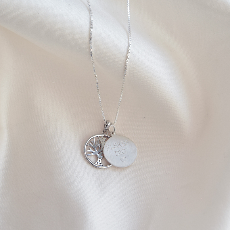 Ved siden af livets træ hænger en klassisk rund amulet, som giver mulighed for personlig gravering på begge sider. Her kan du indgravere et navn, en dato eller en kort besked, der gør halskæden helt unik og skaber et smykke med personlig historie.