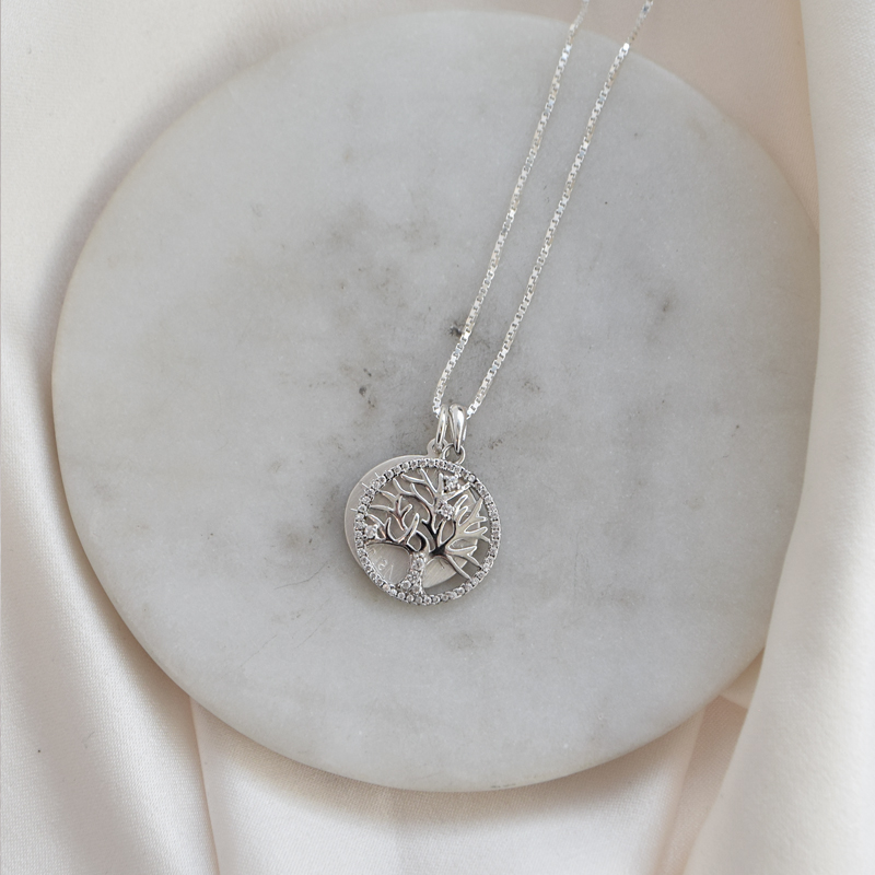 En smuk og symbolsk halskæde i sterling sølv med et detaljeret livets træ vedhæng prydet med funklende zirkonia sten. Livets træ symboliserer livets rødder, styrke og forbindelsen mellem familie og generationer, hvilket giver smykket en særlig og personlig betydning.