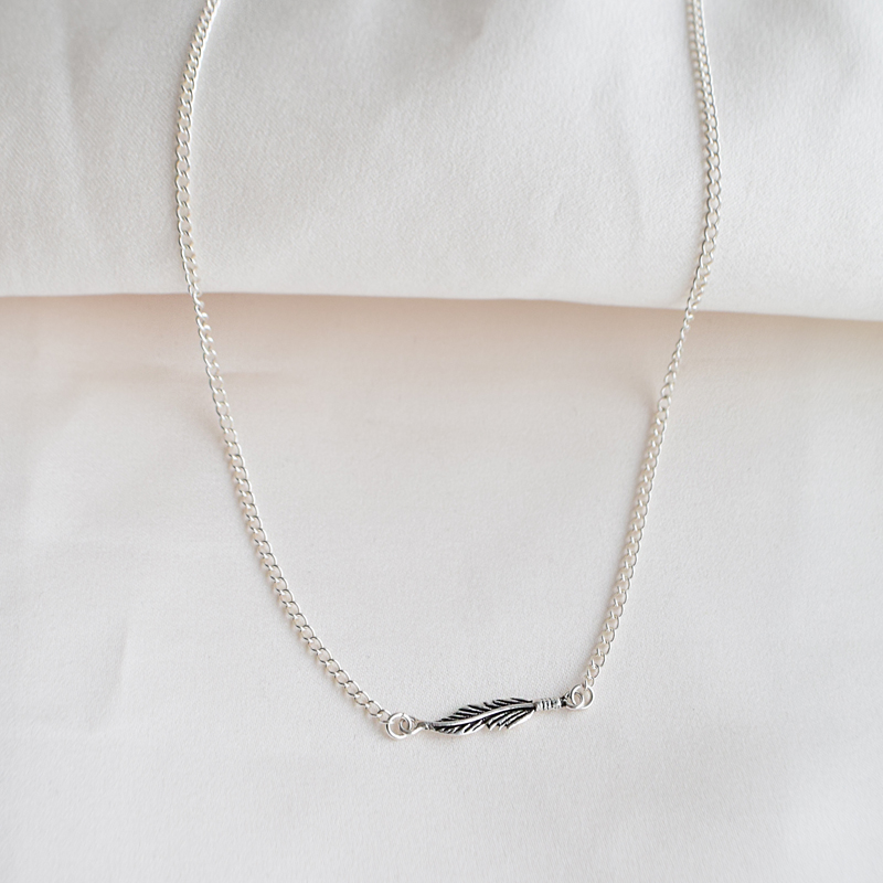 En let og stilren halskæde i ægte sterling sølv med et fint fjer-vedhæng i et slankt, detaljeret design. Den kølige sølvglans skaber et roligt og moderne udtryk, mens den enkle form giver et rent og tidløst look.