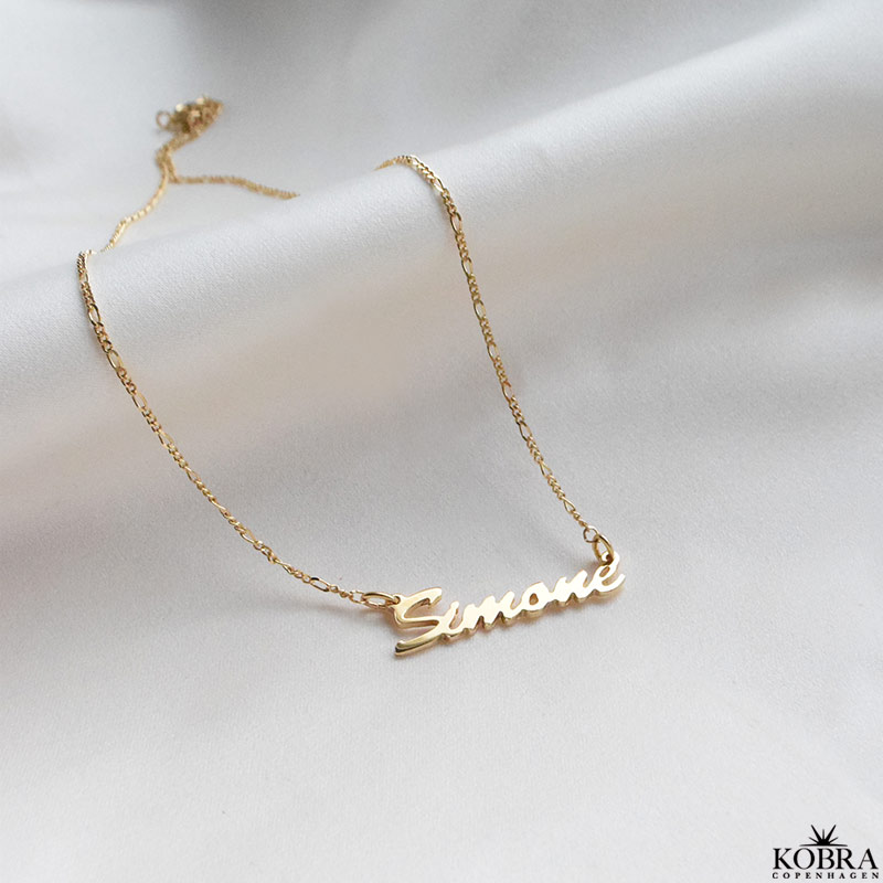 En håndlavet navnehalskæde i elegant design – skabt på vores danske værksted med fokus på kvalitet og personlighed. Halskæden fremstilles i 18 karat forgyldt 925 sterlingsølv, og du kan få lavet netop det navn, du ønsker.