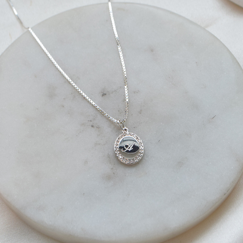 En elegant og feminin halskæde i ægte sterling sølv med rundt vedhæng indrammet af klare zirkonia sten. Den fine stenkant giver et diskret og eksklusivt udtryk, mens den blanke midte skaber den perfekte flade til personlig gravering.