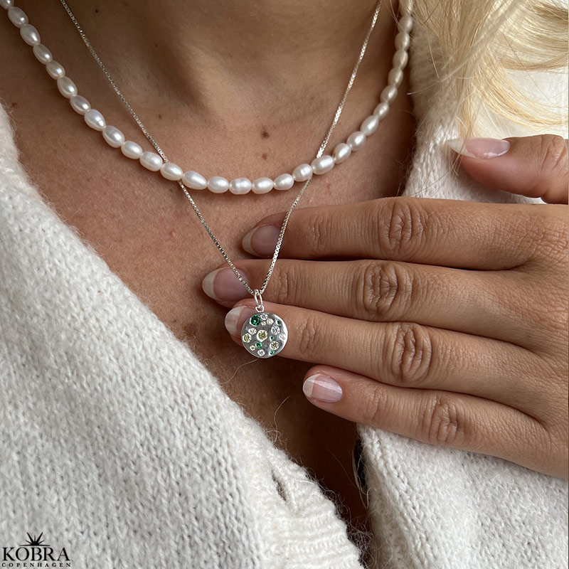 ... er en moderne sølvhalskæde med et rundt vedhæng besat med grønlige og gullige sten i forskellige størrelser. Det organiske design giver et unikt og levende udtryk, som fanger lyset og tilfører dit look en frisk kant. Perfekt til både hverdag og fest, alene eller i kombination med andre kæder.