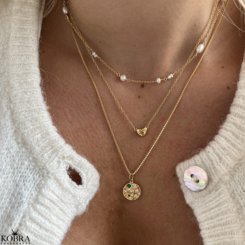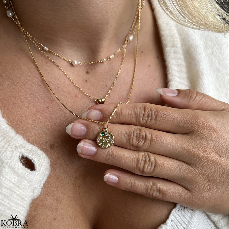 Amalfi halskæden i 18k forgyldt sterlingsølv er et elegant smykke med et moderne twist. Det runde vedhæng er dekoreret med grønlige og gullige sten i forskellige størrelser, som giver et legende og organisk udtryk. En guldhalskæde, der fanger lyset smukt og kan bæres alene som statement eller styles med andre kæder for et trendy layered look.