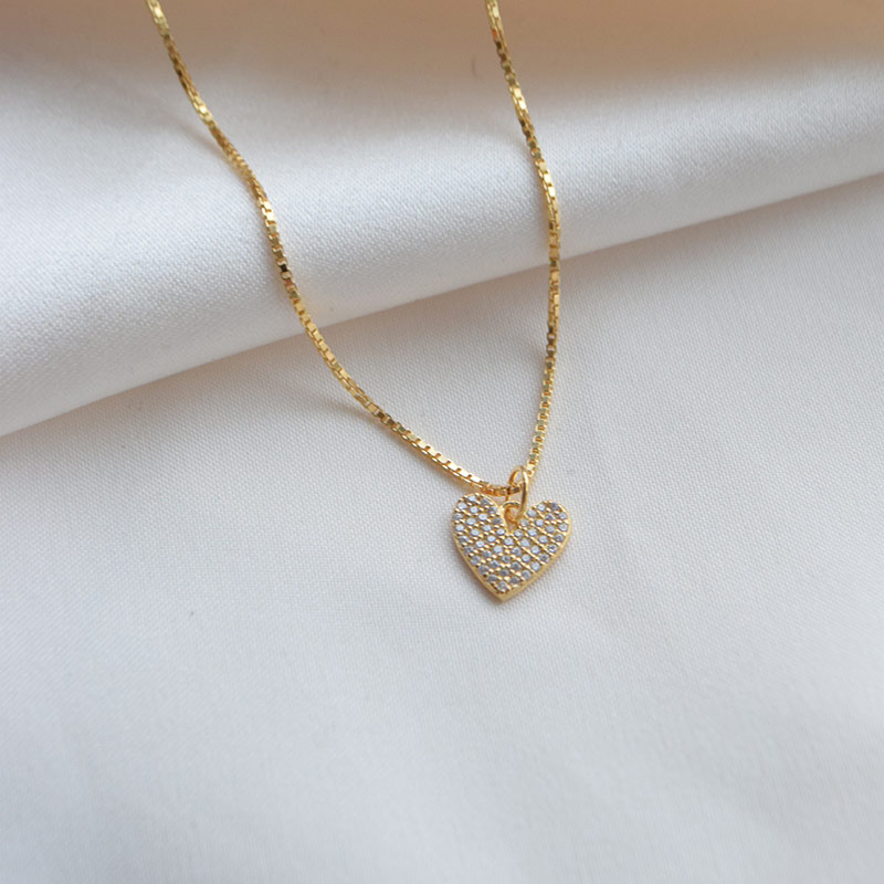 Vores fine og elegante hjerte halskæde i guld, smukt dekoreret med funklende klare sten.