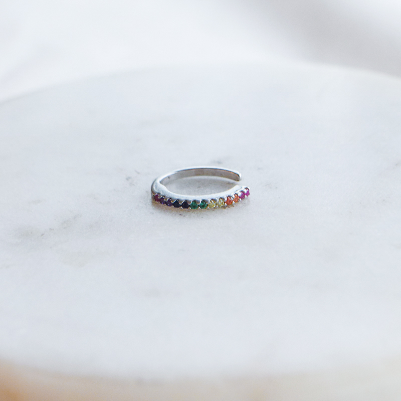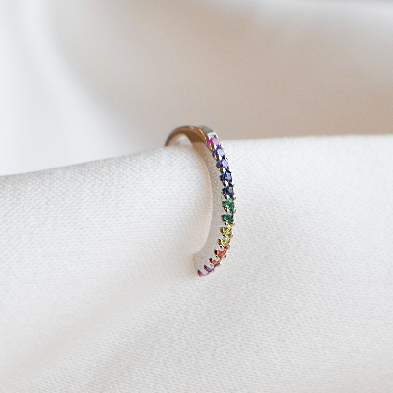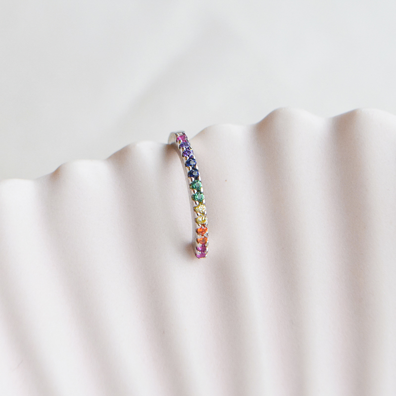 Denne earcuff er udført i sterling sølv og har et slankt design med forskelligfarvede sten placeret tæt langs ydersiden. De farvede sten skaber et levende og varieret udtryk.