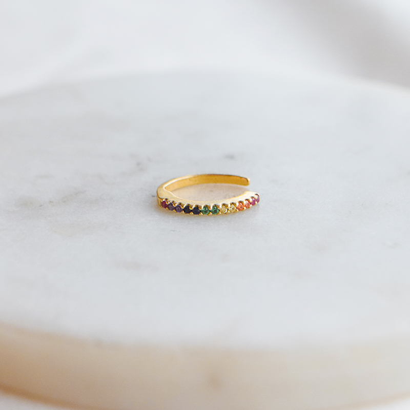 Denne earcuff er udført i 18 karat forgyldt sterling sølv og har et slankt design med forskelligfarvede sten placeret tæt langs ydersiden. De farvede sten skaber et levende og varieret udtryk.