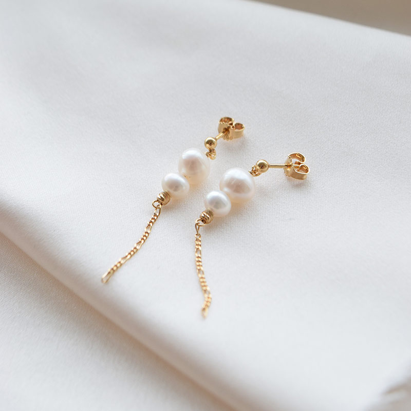 Håndlavet perle øreringe med guld figaro kæde. Ægte hvide ferskvandsperler med lille guldkugle.