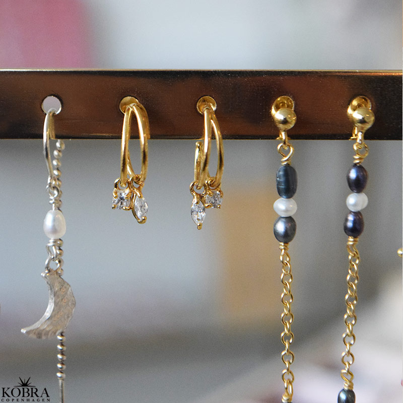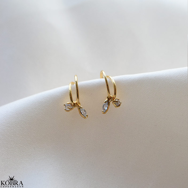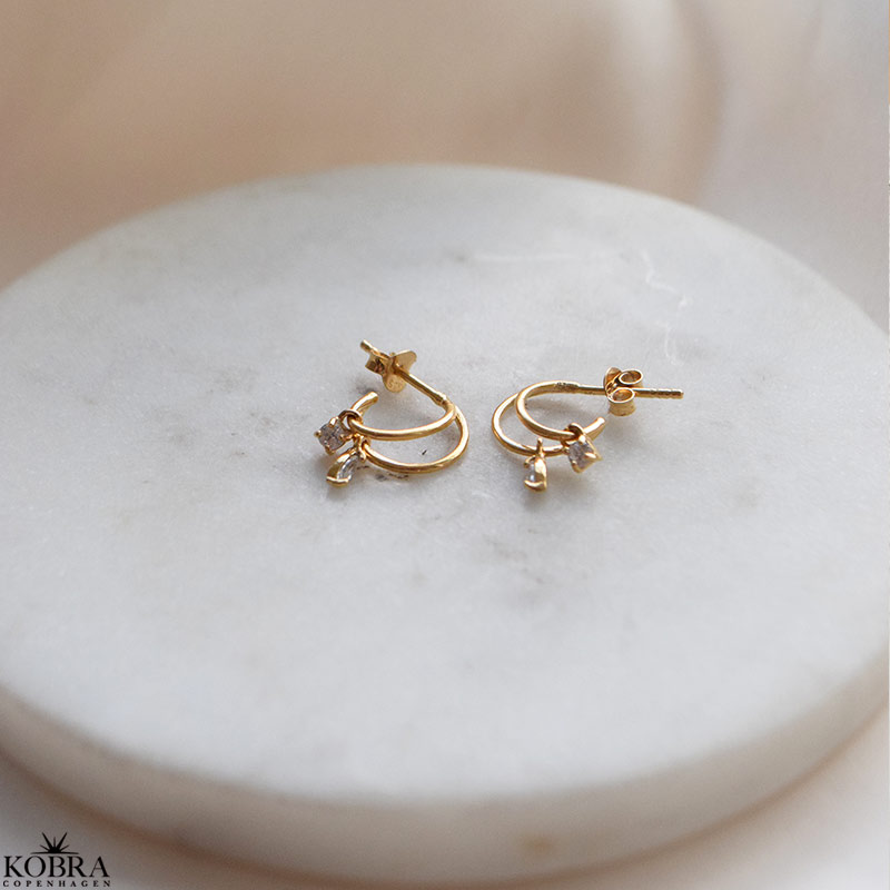 .... er feminine og elegante hoops i 18 karat forgyldt sterling sølv. Smykket kombinerer en klar dråbeformet zirkonia med en funklende firkantet sten – en smuk kontrast, der skaber et sofistikeret og moderne udtryk.