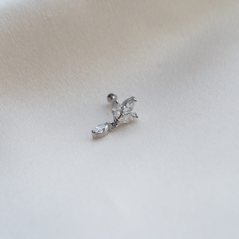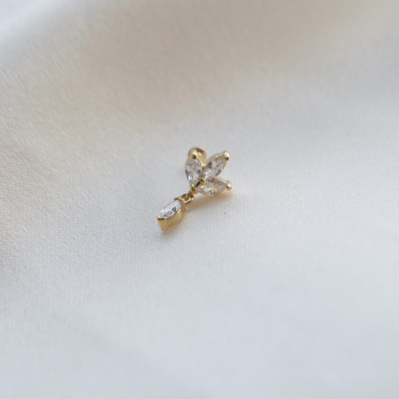 Elegant piercing med blade og en fin dråbeformet sten, der giver et let, feminint udtryk med en smule bevægelse.