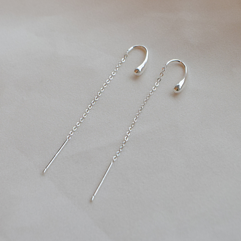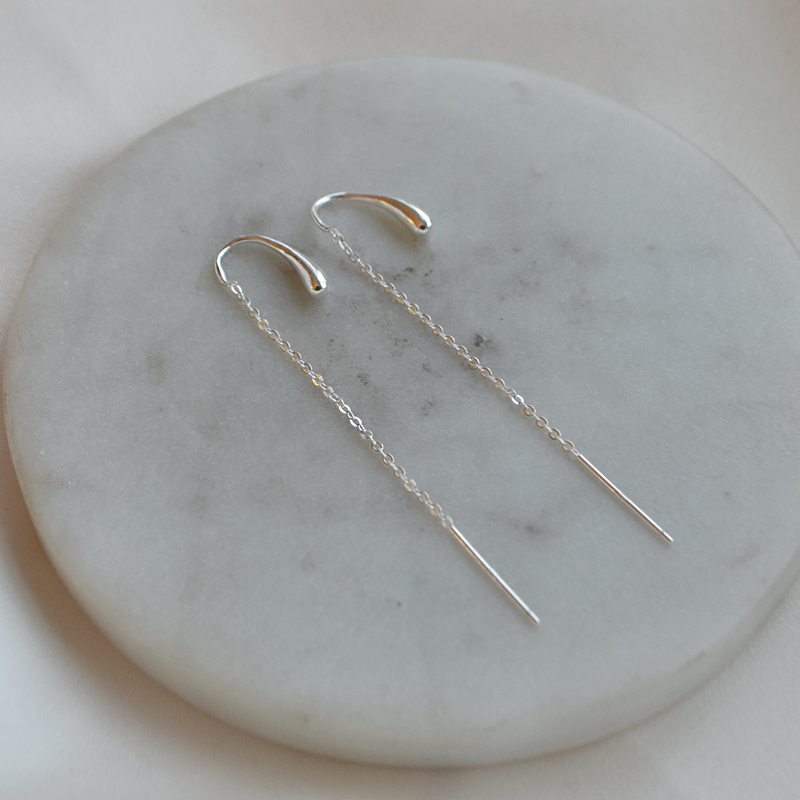 Mara øreringe er udført i sterling sølv og har et slankt gennemtræksdesign. Foran øret sidder et dråbeformet sølvelement, mens en fin kæde falder lodret ned bag øret.