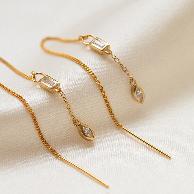 De fine sten tilfører et diskret shine, der fanger lyset – uden at blive for meget. Designet er skabt til dig, der elsker lange øreringe med kæde, threader earrings og stacking med flere huller.