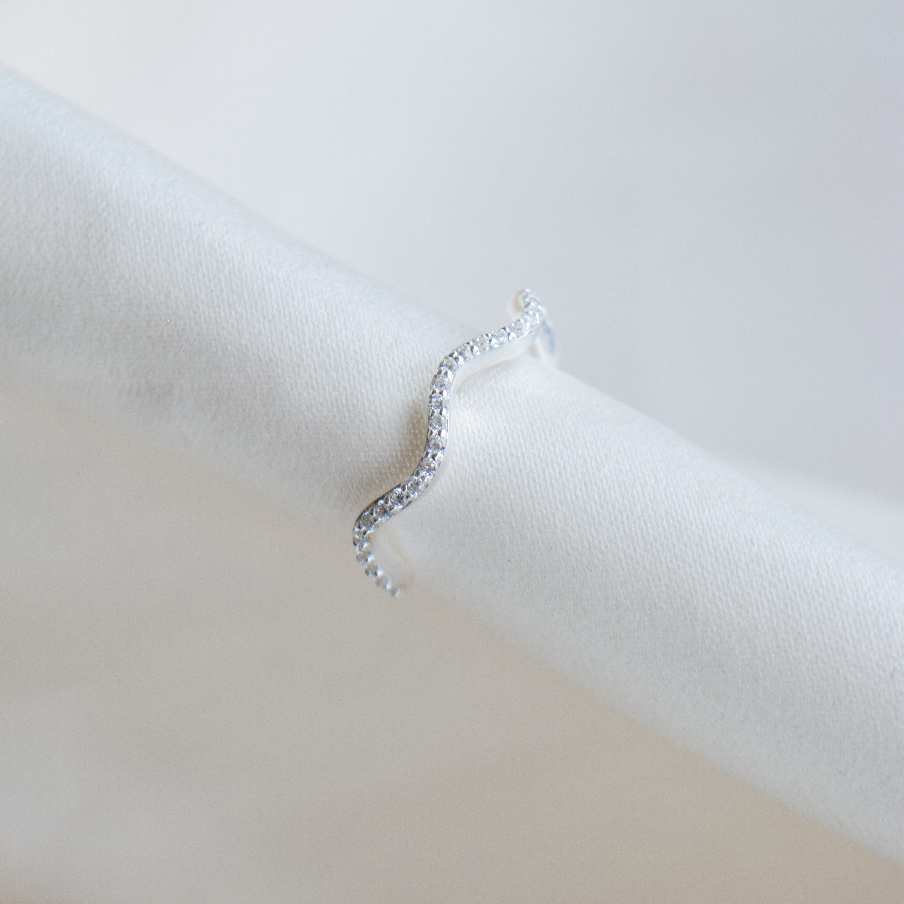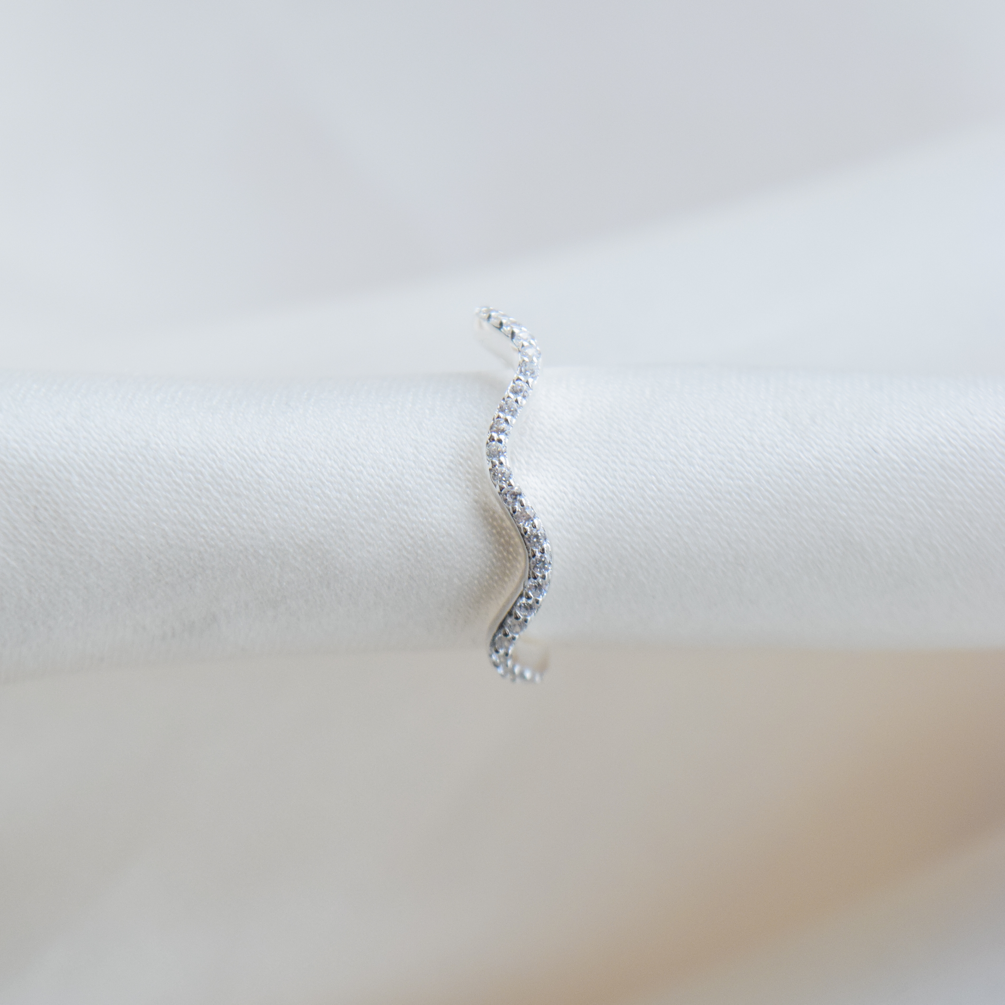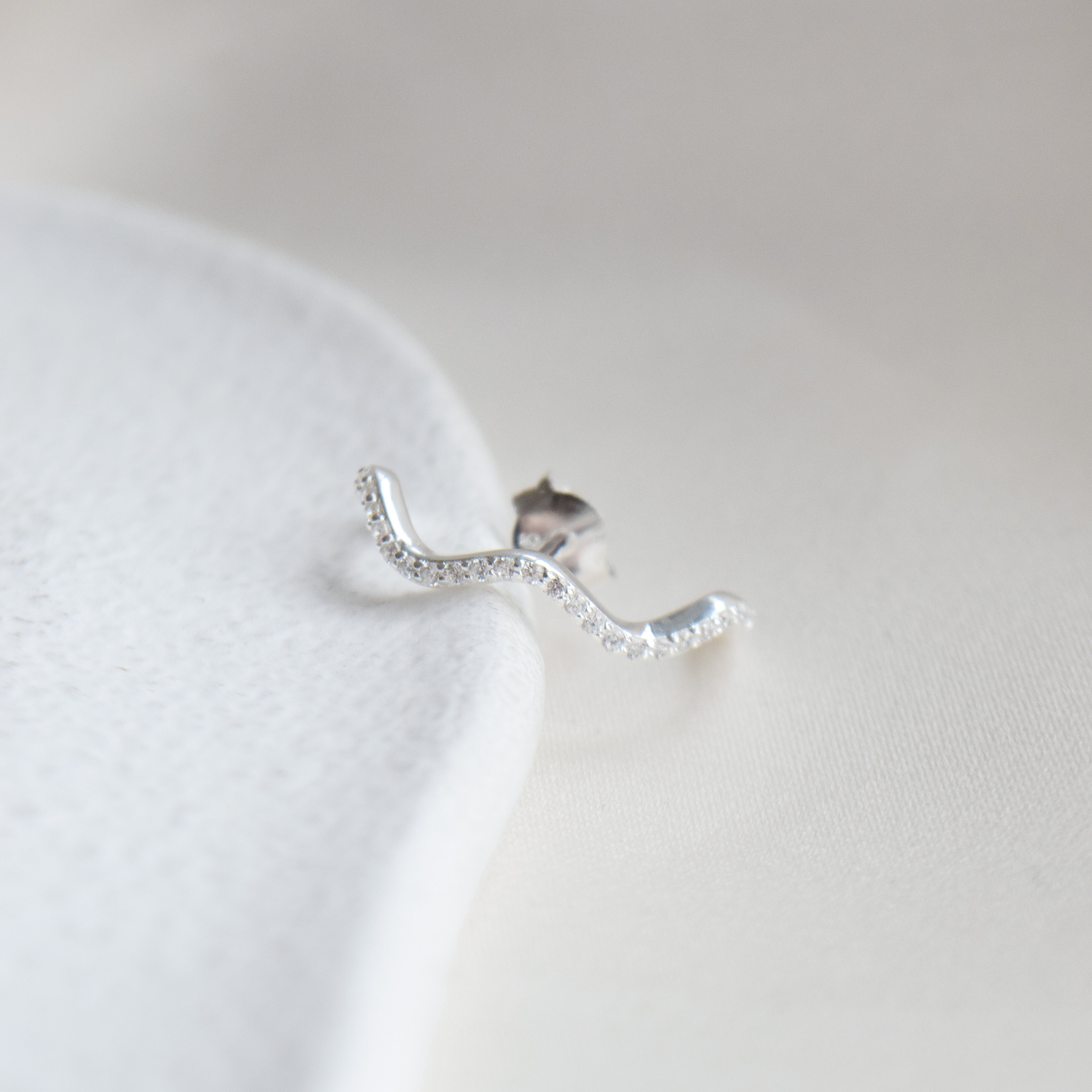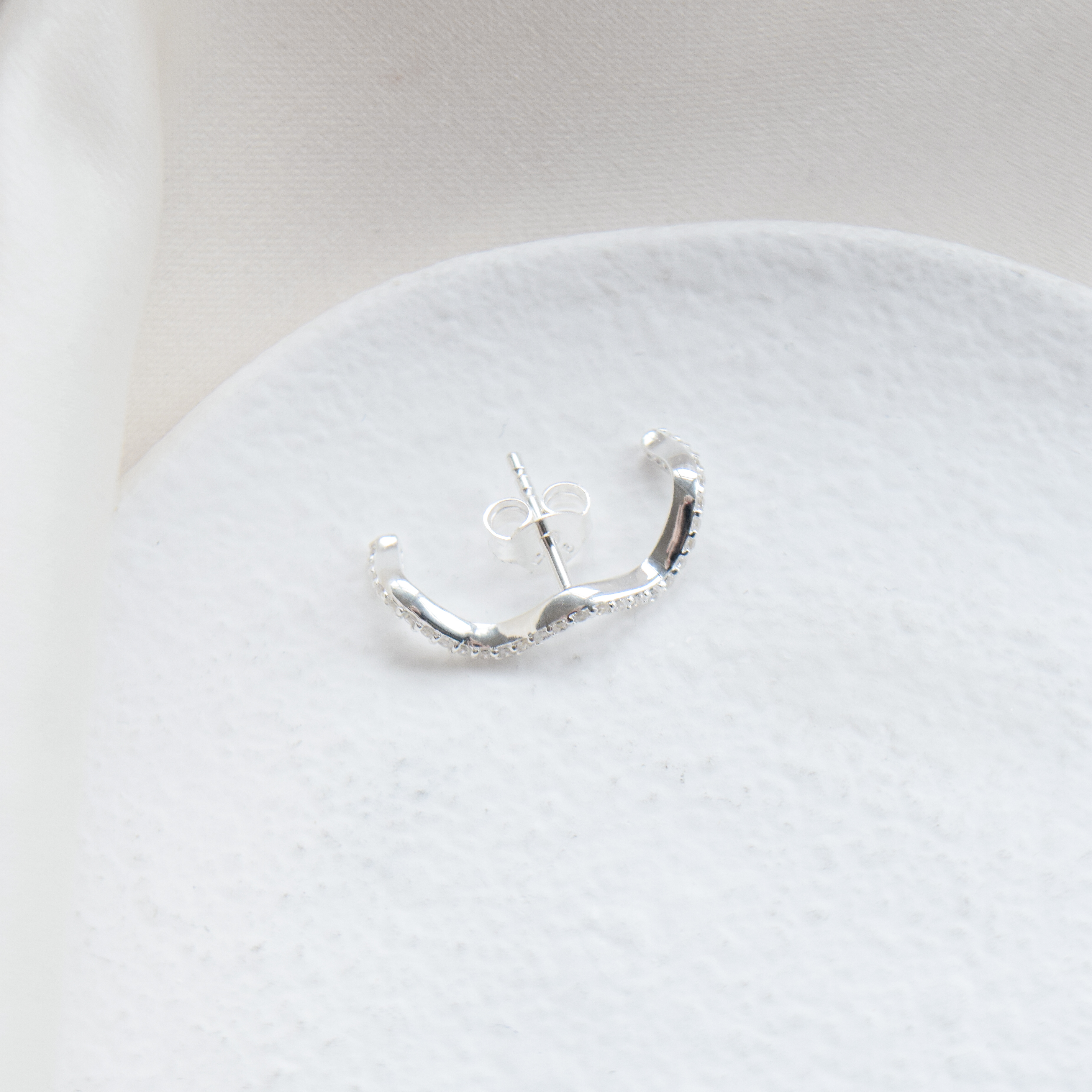 Den bølgede form med fine, klare zirkonia sten giver lidt sparkle, mens designet smyger sig langs øreflippen. Øreringen sættes i ét hul og følger ørets naturlige linje.