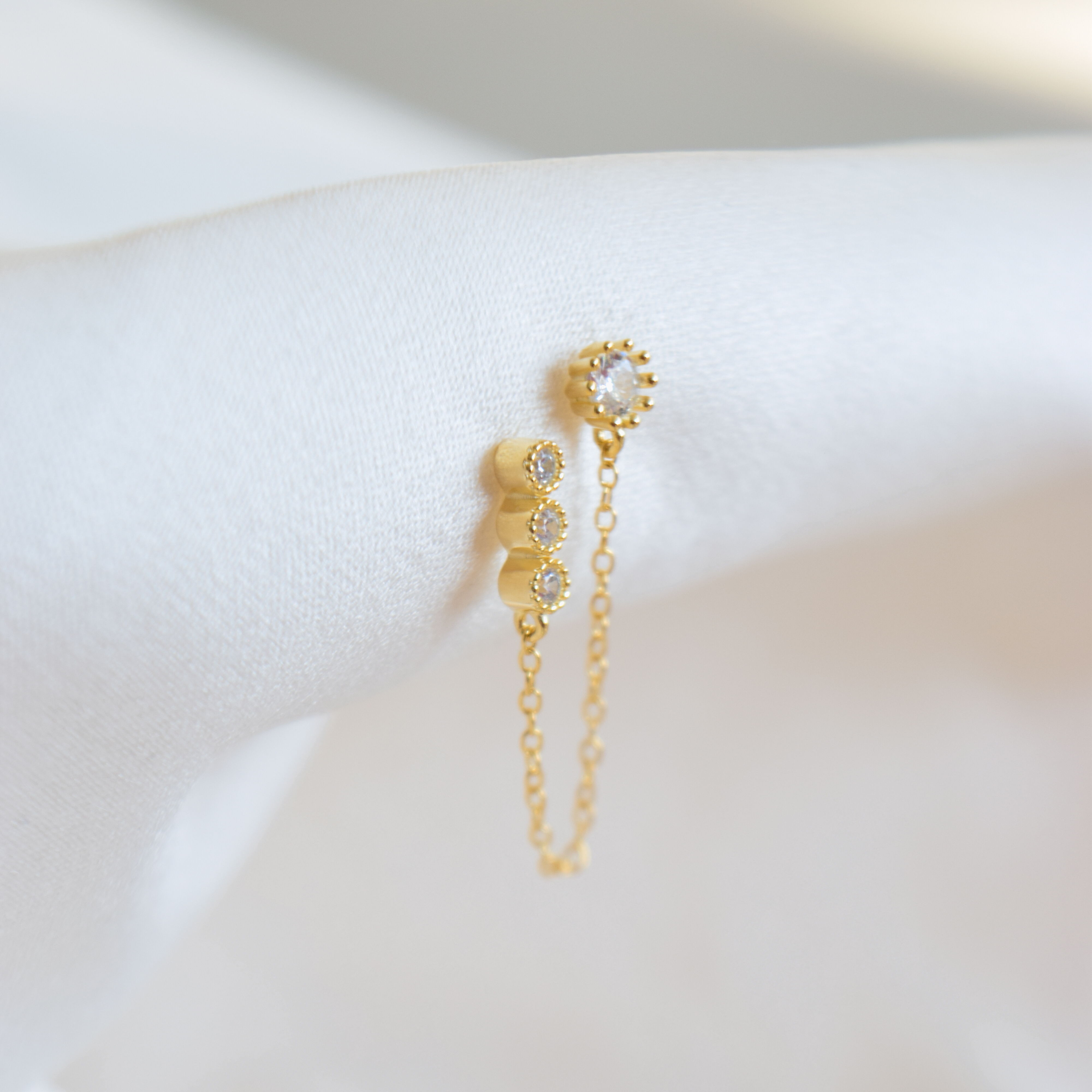 De fine zirkonia sten er smukt placeret asymmetrisk i ørestikkerne, som forbindes med en tynd kæde, der skaber et let og eksklusivt look.