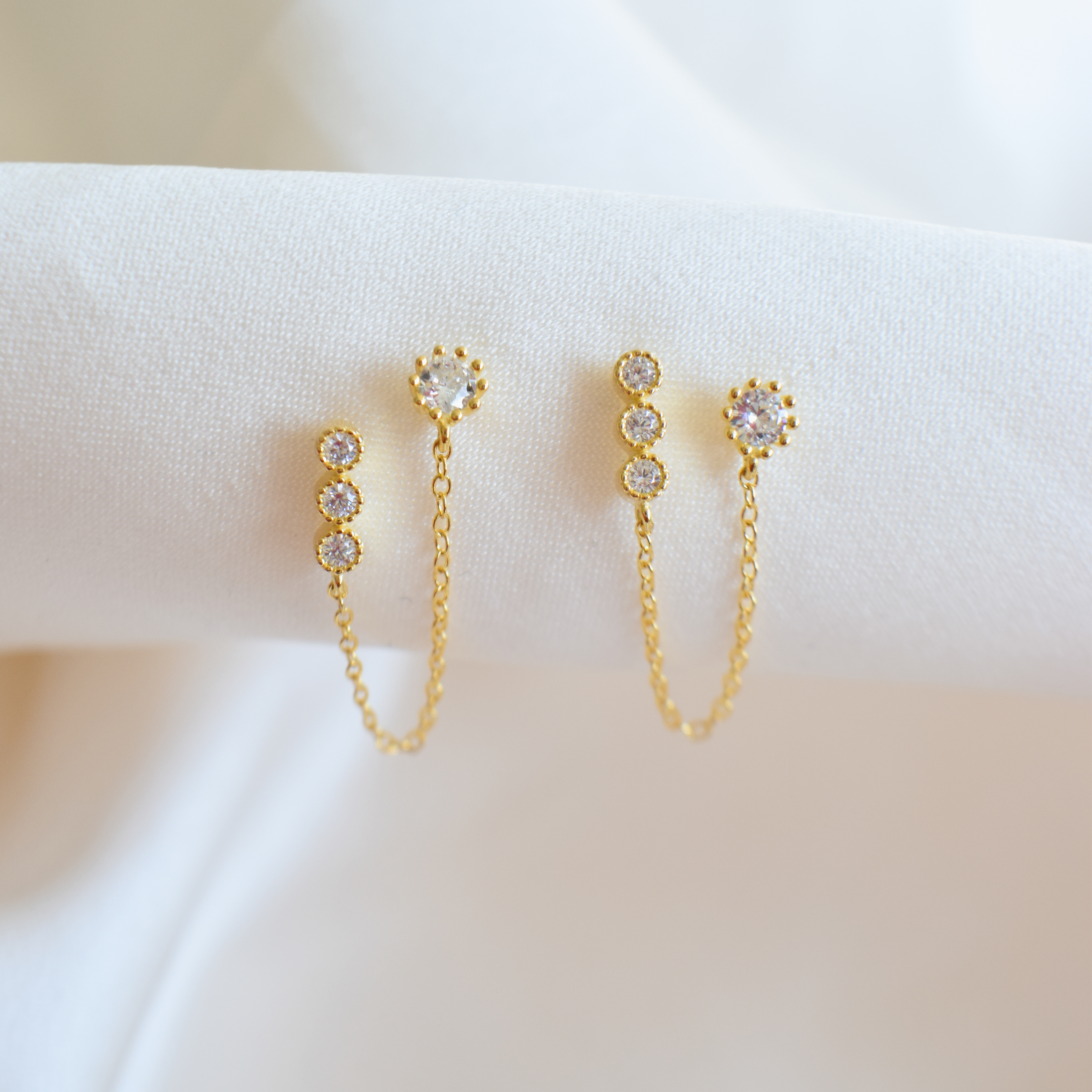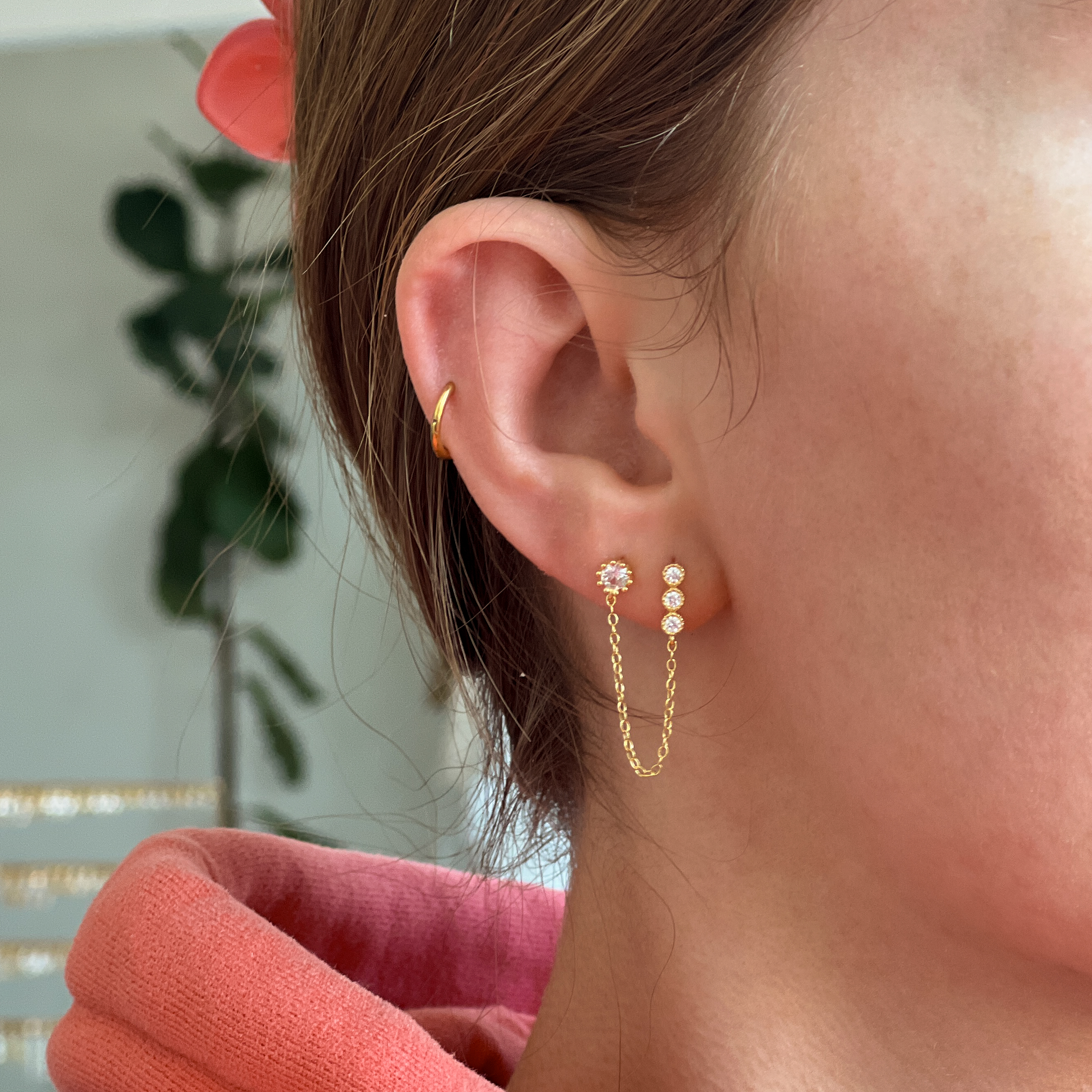 Øreringen sættes i to huller, hvor kæden elegant forbinder dem og giver en iøjnefaldende effekt.