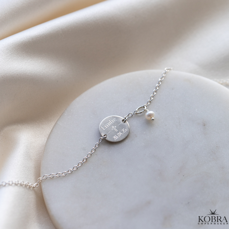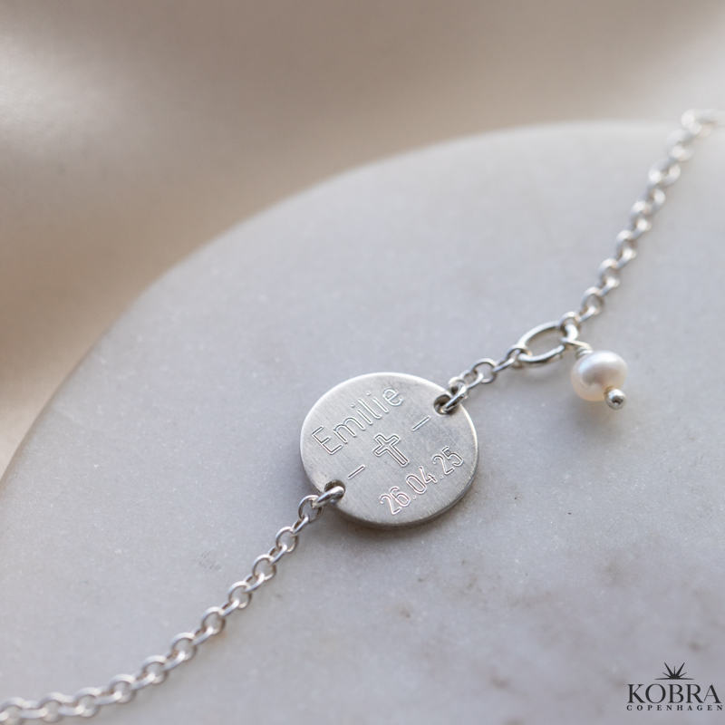 Konfirmationssmykke - sølv armbånd med ægte ferskvands perle og personlig gravering
