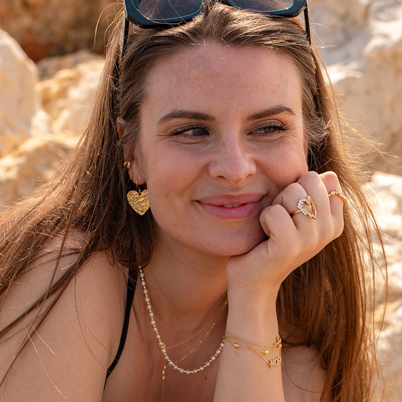 Fem små hjerter – én kærlig påmindelse. Liva armbåndet er et elegant og feminint armbånd i 18 karat forgyldt sterlingsølv, prydet med fem små hjerter i et blødt, afrundet design. Det er smykket, du tager på uden at tænke – men som siger det hele. Perfekt som gave til en, du holder af (og ja, det må godt være dig selv).