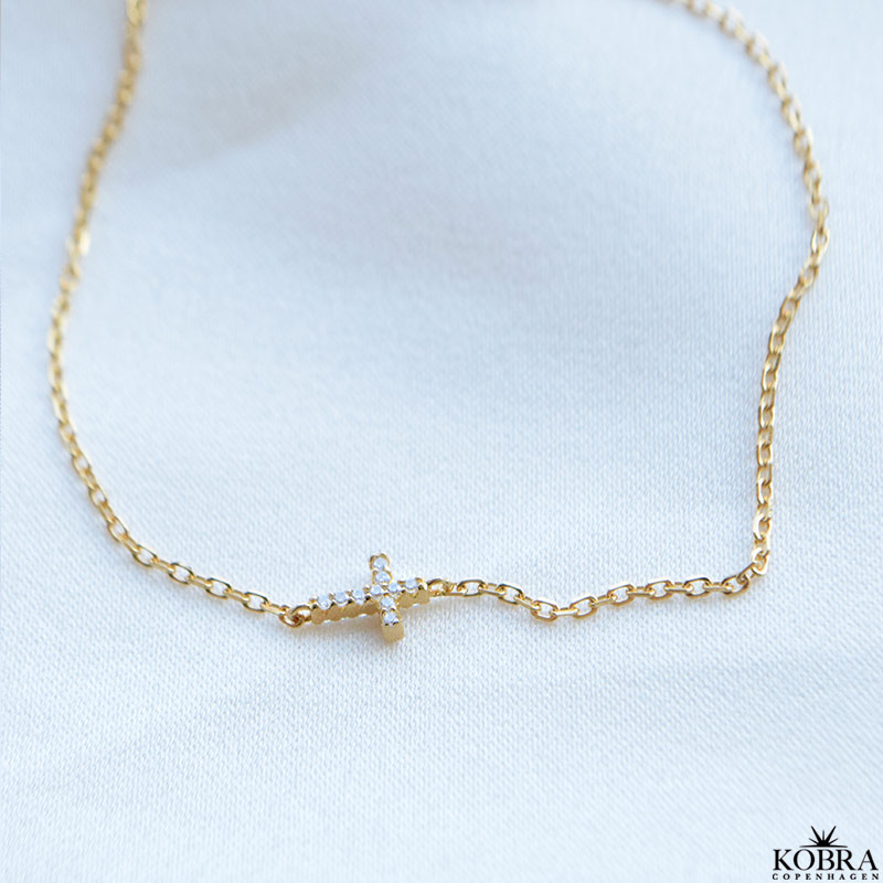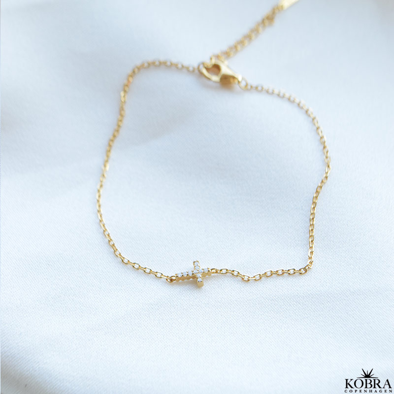 Et elegant og tidløst armbånd i 18 karat forgyldt sterlingsølv med et lille kors med klare zirkonia. Det enkle design gør armbåndet perfekt både til hverdag og fest – alene eller i kombination med dine andre favoritarmbånd. Kors-symbolet giver et klassisk og personligt udtryk, der gør armbåndet til en smuk gaveidé til konfirmation, fødselsdag eller venindegave.