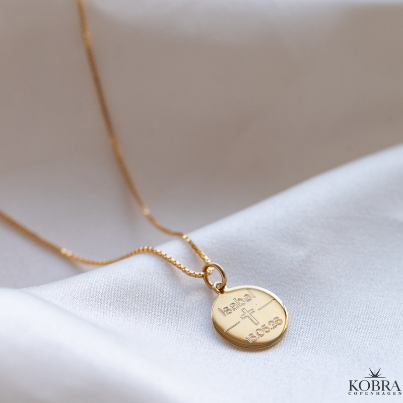 Bagsiden af smykket er blankt og her kan du selv vælge din gravering. For eksempel en lille sød besked eller flere navne og datoer.