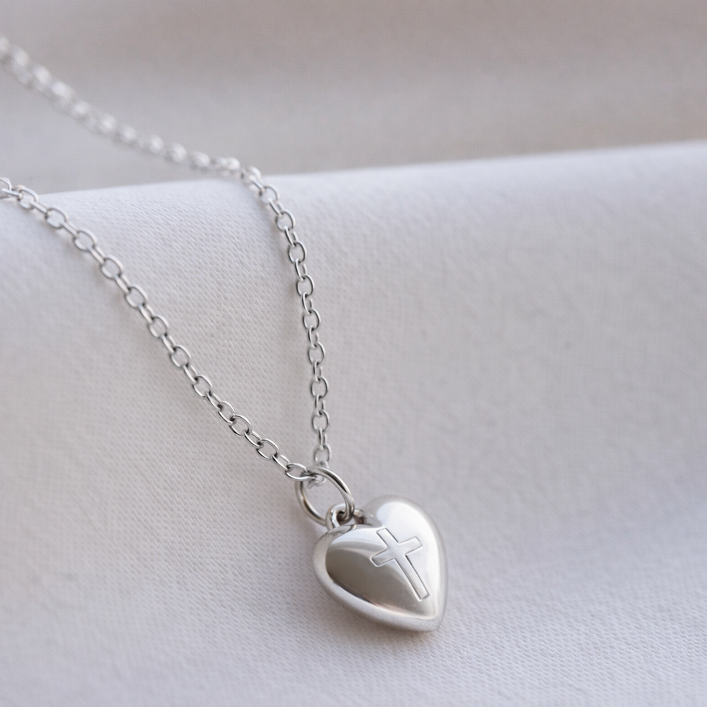 Smuk, klassisk hjerte halskæde i sterling sølv med et lille symbolsk kors graveret på forsiden.