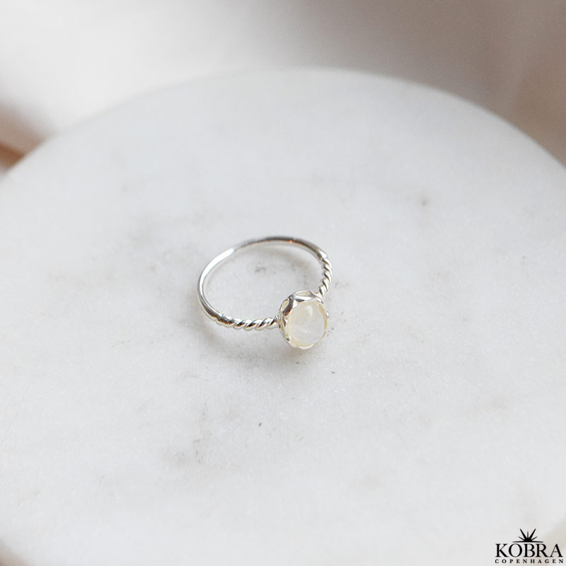 Skøn og anderledes sølv ring hvor selve ringskinnen er snoet sølv. Den smukke sten er en "rainbow moonstone" som alle kan varierere lidt i nuance.