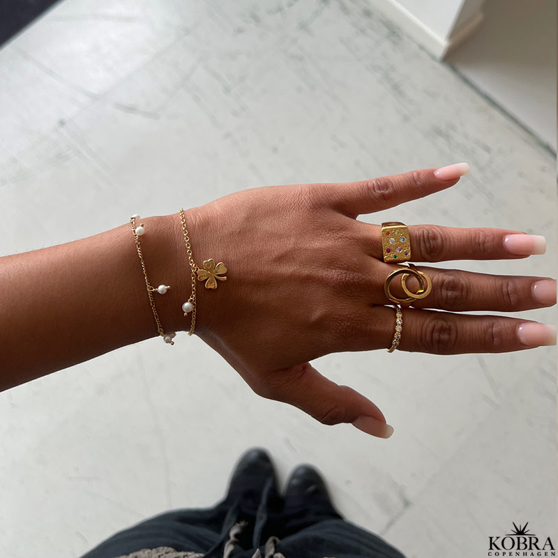 Smuk guld ring med cirkler viklet ind i hinanden.